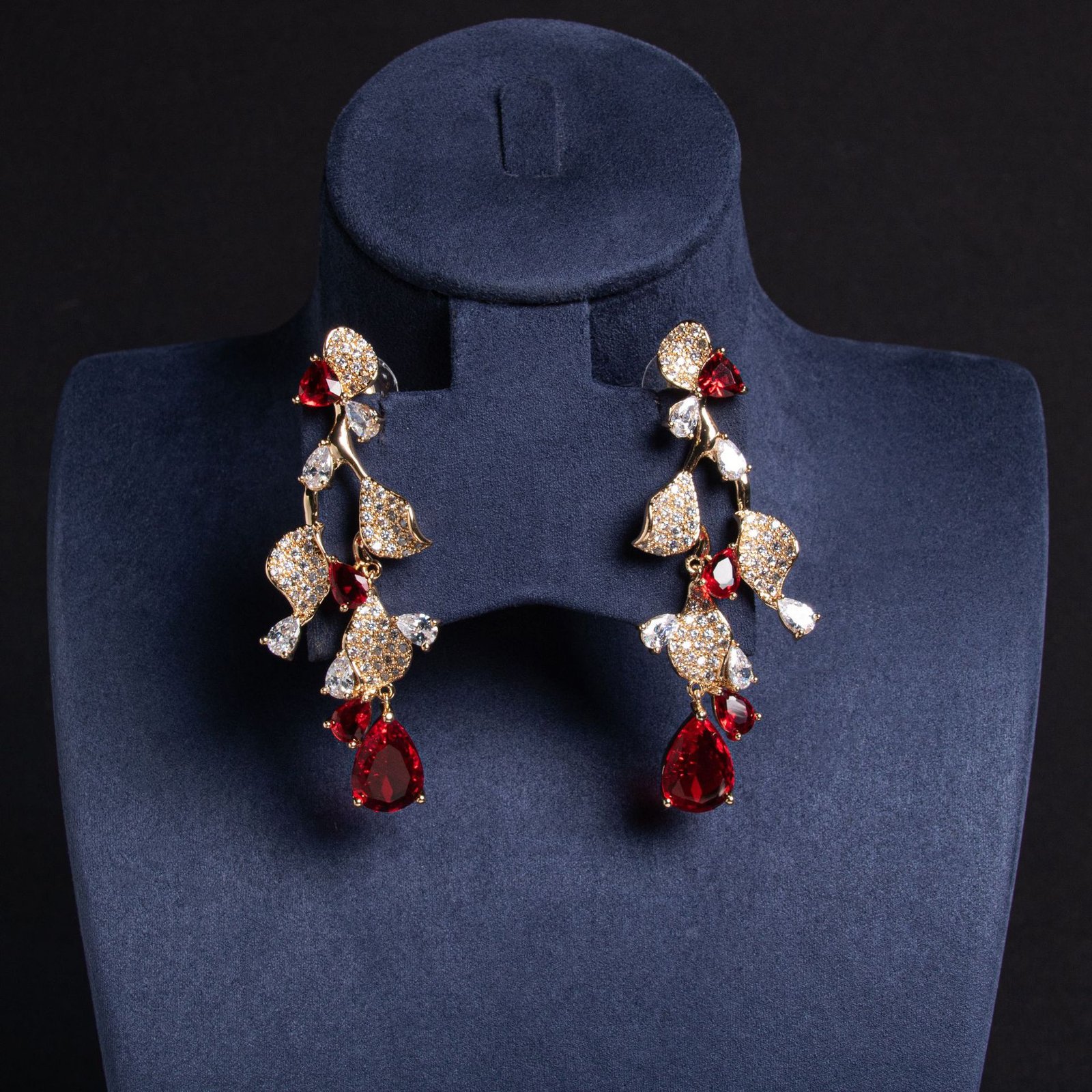 Luxury teardrop zircon earrings for brides, wedding and banquet accessories, long silver needle and leaf earrings