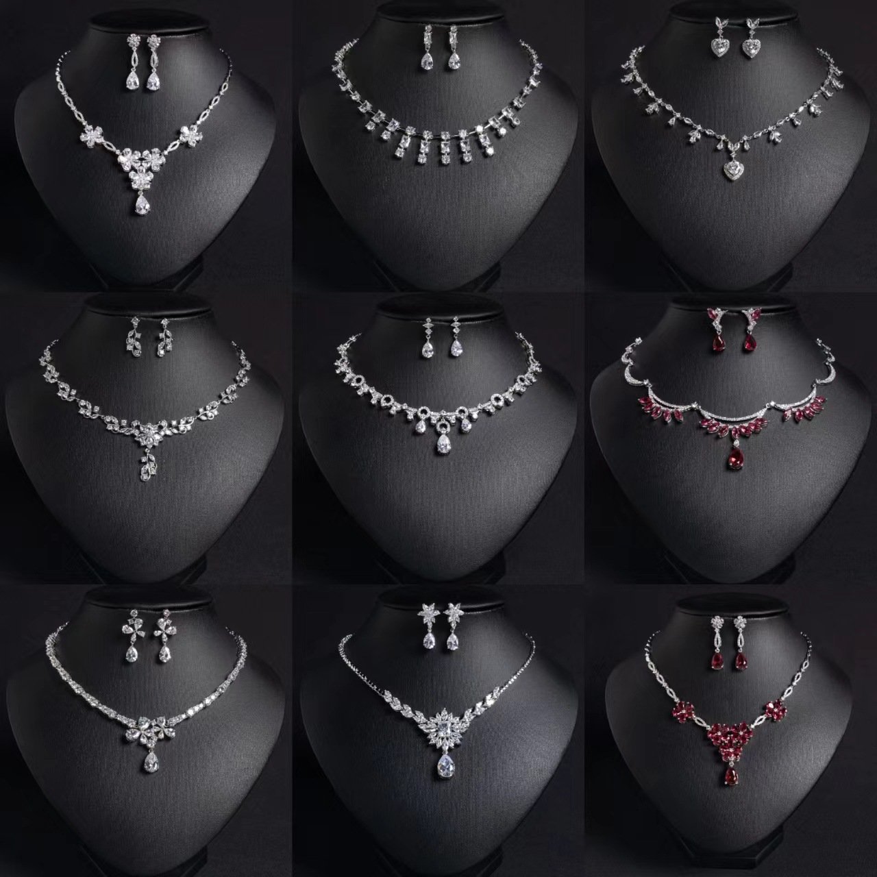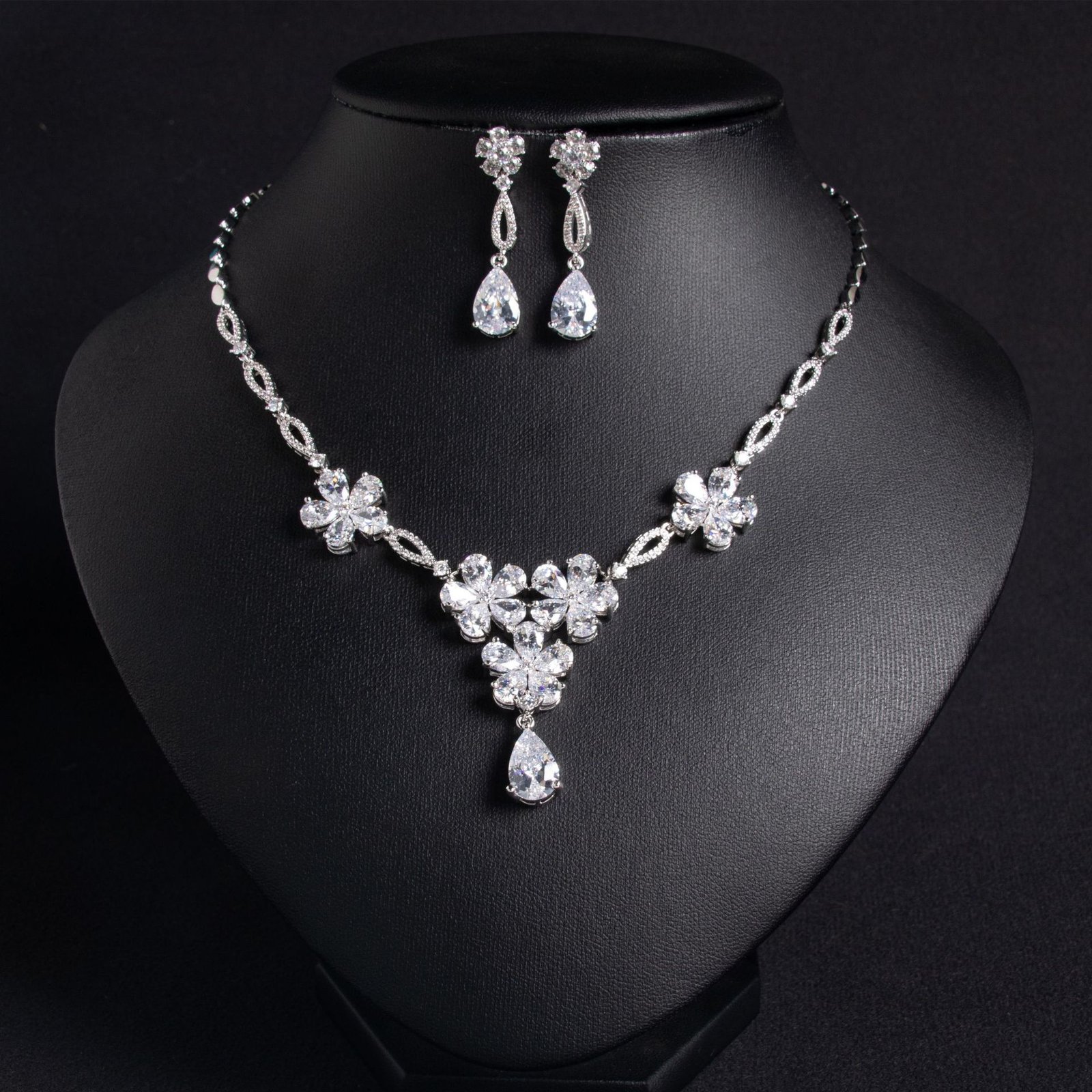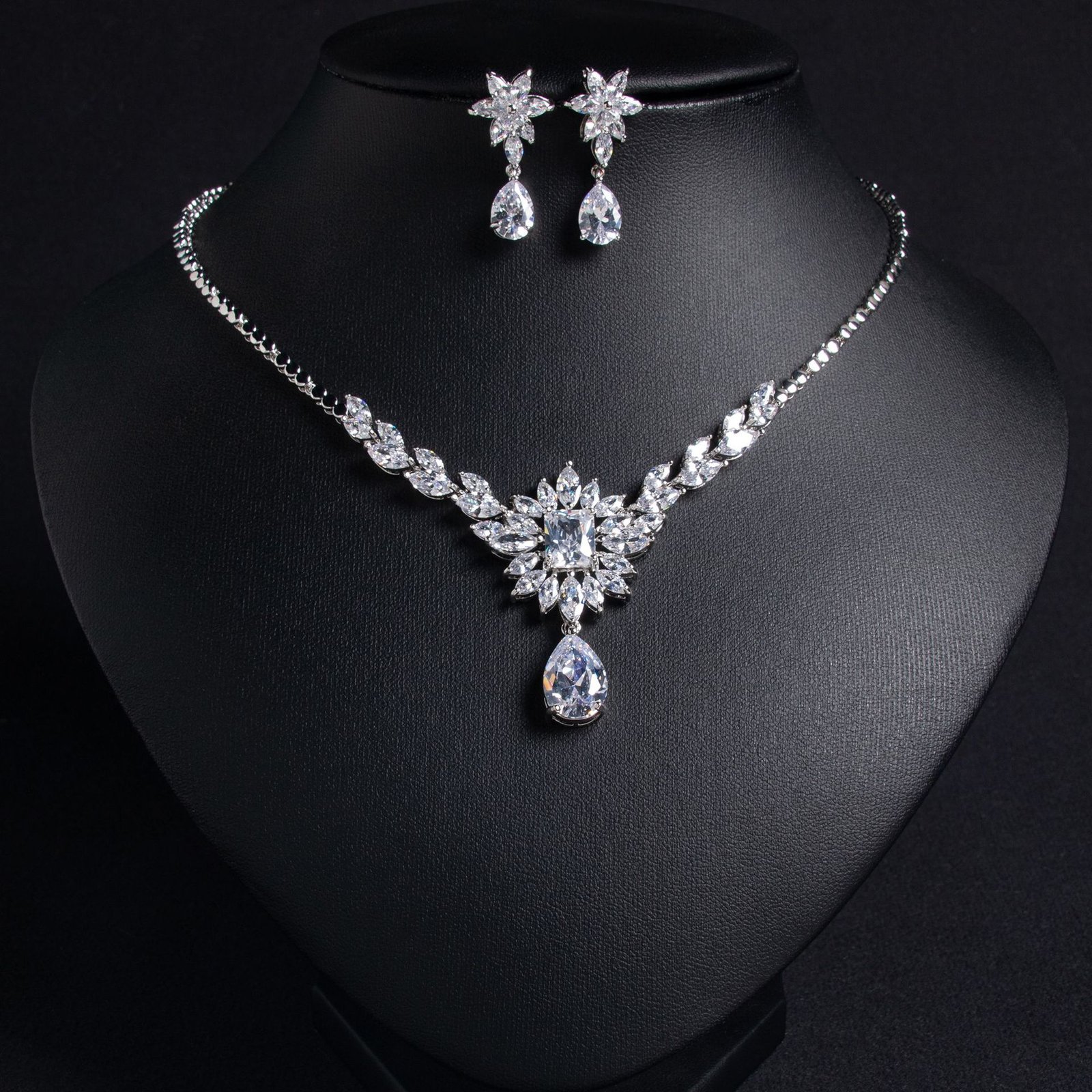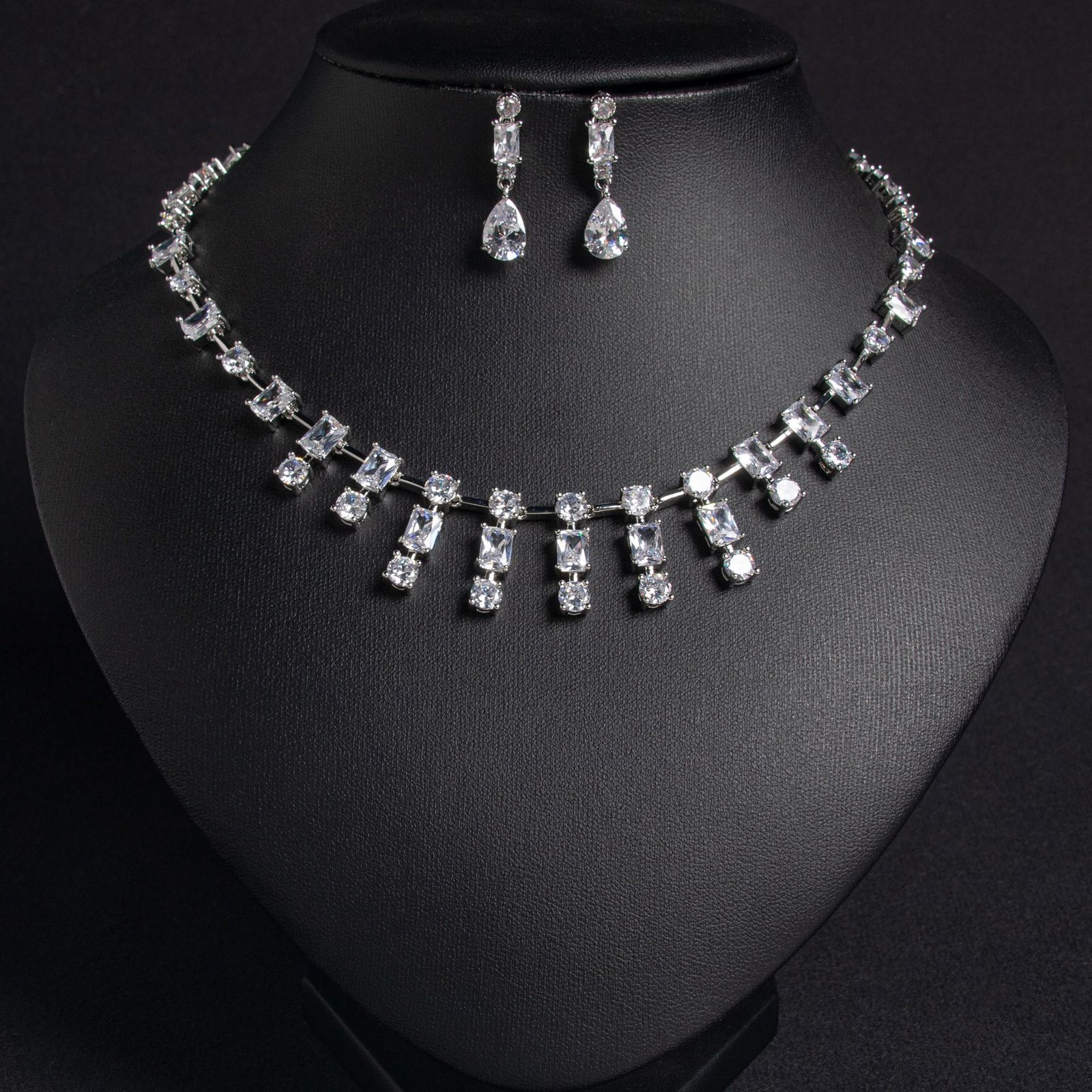 This stylish and dazzling set of zircon teardrop necklace and earrings is perfect for brides to wear on their wedding day, exuding a glamorous and sophisticated aura.